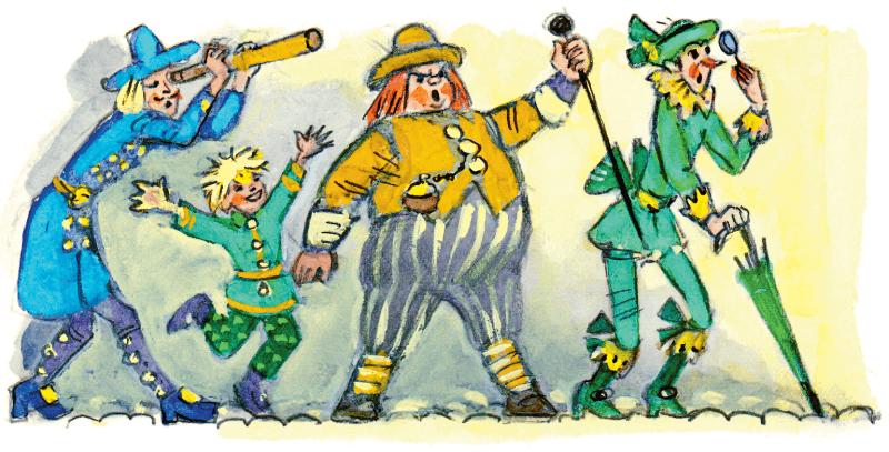 Самые интересные места были за городом – там, где находился Дворец Трёх Толстяков. Доктор чаще всего посещал эти места. Дворец Трёх Толстяков стоял посреди огромного парка. Парк был окружён глубокими каналами. Над каналами висели чёрные железные мосты. Мосты охранялись дворцовой стражей – гвардейцами в чёрных клеёнчатых шляпах с жёлтыми перьями. Вокруг парка до самой небесной черты находились луга, засыпанные цветами, рощи и пруды. Здесь было отличное место для прогулок. Здесь росли самые интересные породы трав, здесь звенели самые красивые жуки и пели самые искусные птицы.