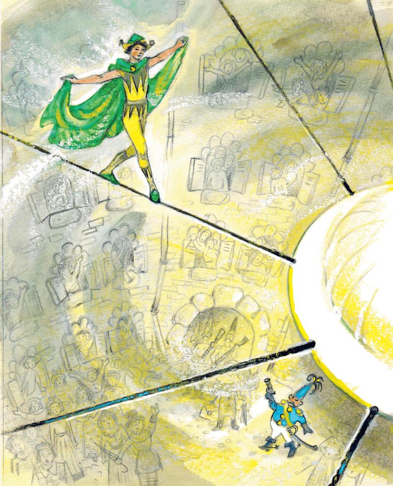 С этим же плащом, в этом же трико, сшитом из жёлтых и чёрных треугольников, народ привык его видеть во время представлений на ярмарках и воскресных гуляньях. Теперь высоко, под стеклянным куполом, маленький, тоненький и полосатый, он был похож на осу, ползающую по белой стене дома. Когда плащ раздувался, казалось, что оса раскрывает зелёные блестящие крылья.