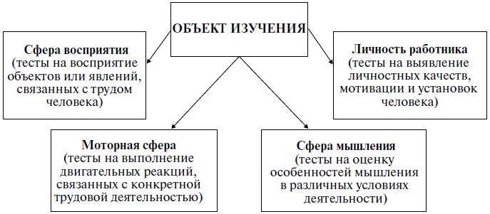Тестирование – метод, во время применения которого испытуемые выполняют определенные действия по заданию исследователя. С его помощью можно исследовать различные аспекты производственной деятельности человека: его моторную сферу, особенности восприятия, мышления, личностные качества. Соответственно первая классификация тестов, применяемых в психологии труда, состоит из четырех категорий (рис. 1.6).