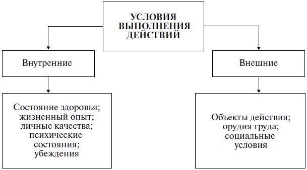 Различают внутренние и внешние условия осуществления действий и операций: