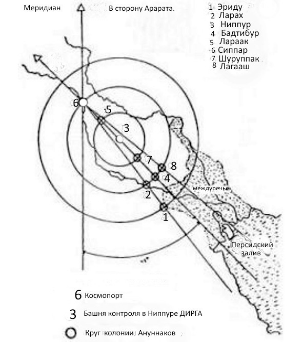 – … Отец нашёл способ замирить нас и не нарушать договорённость с Орденом Белых мудрецов и его Небесными Родами, кои жили совсем недалеко. Он, оказывается, встретился с ними сам и укрепил договор, который они заключали со мной. Так был разработан общий план освоения Междуречья. Решили, взяв за ориентир гору Арарат («образ» слова – земли ариев с обеих сторон) построить на ней наблюдательный космодром с коего можно следить за Золотым Поясом. Далее, следуя тем же ориентиром, этой же линией, в Междуречье, должен был возведён ещё один космопорт для приёмки и перевозки добытой нами руды. Строить всё обязывался ЭНЛИЛЬ. Ниппур, таким образом, оказывался в центре этого круга и другие города нашего пояса влияния должны были строиться строго по окружностям от него, на равном расстоянии и удалении друг от друга. В этом плане было учтено всё: и города, кои будут осуществлять переработку руды, и другие города, кои должны были дорабатывать её до состояния звёздной «пыли» и отправке в космопорт. Сам космопорт должен был расположен недалеко от горы Арарат. Тем самым, Белые Мудрецы могли спокойно осуществлять контроль за происходящим в Золотом Поясе. И тогда, согласно договору, ничто не могло быть утаено от Светлооких, так как космодром Ану был в непосредственной «близости» от горы. Предложение отца приняли все стороны. Даже, те ануннаки, кои были возмущены нашёптыванием игигов. Выходить нашей колонии за радиус запланированных договором окружностей на котором располагался первый город Эриду, который построил я – Эа, было равносильно нарушению договора.