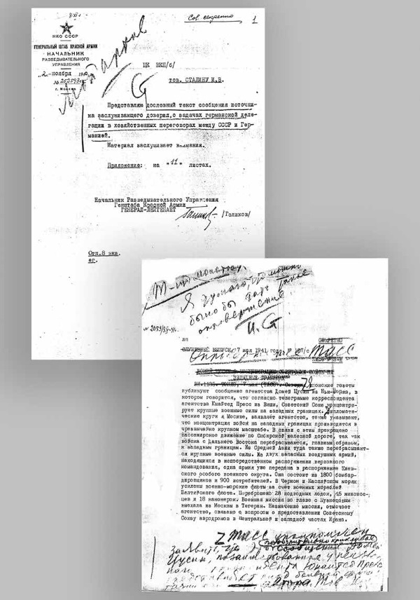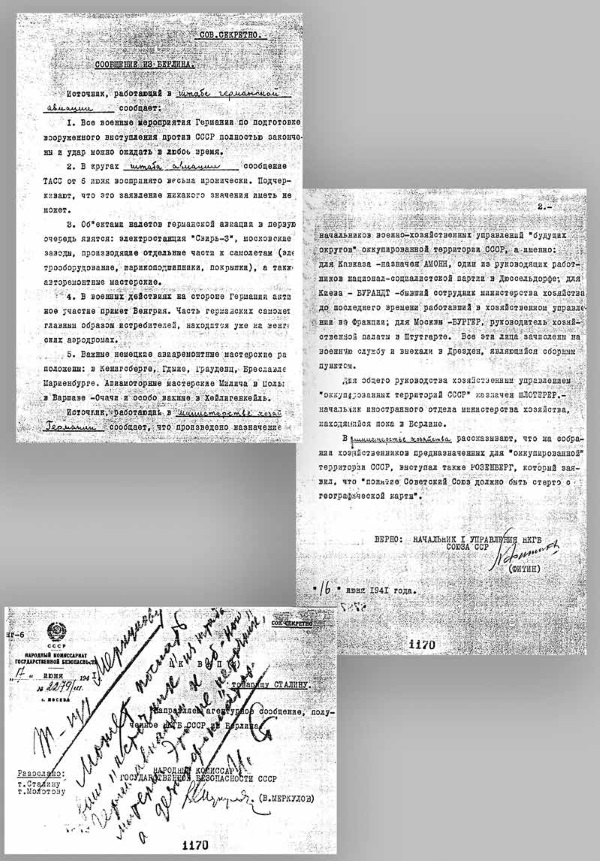 Р. Такер: Информация о приближении неизбежного вторжения поступала не только от советской разведки, но и из других источников. Так, она содержалась в телеграмме британского премьер-министра Уинстона Черчилля, сообщение которого Сталин, наряду с другими аналогичными материалами, не направил в свой Генеральный штаб. Сталин расценил это предупреждение как попытку ускорить столкновение между ним и Гитлером.