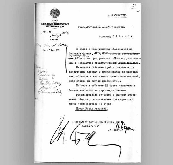 Записка Я. П. Берии с пометками И. В. Сталина