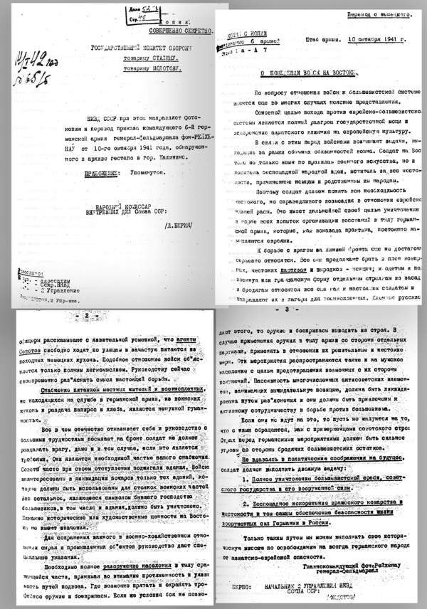 Копии перевода приказа В. фон Рейхенау и сопроводительного письма Л. П. Берии