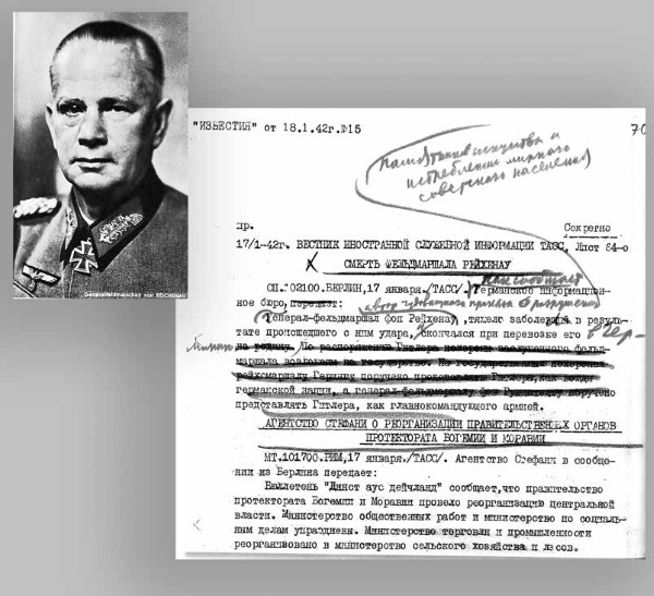 В. фон Рейхенау и сталинская правка сообщения о его смерти (опубликовано в газете «Известия» 18 января 1942 г.)