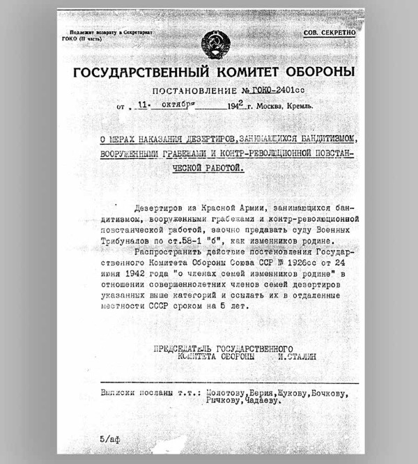 В этих условиях Сталин издал приказ № 227, подписав его в качестве наркома обороны. В приказе вождь в очередной раз возложил вину на других. «Паникеры», «трусы», «неумные люди на фронте», утешающие себя разговорами об избытке ресурсов, объявлялись виновниками поражений Красной армии. Меры, предложенные наркомом, вновь, как и в начале войны, были репрессивными: к расстрелам на месте и заградительным отрядам добавились штрафные роты и батальоны. Правда, на этот раз нарком не стал пугать красноармейцев репрессиями против их родственников. Бойцы и командиры и так должны были помнить приказ № 270 от 16 августа 1941 года. Согласно этому приказу, члены семей сдавшихся в плен лишались государственного пособия и помощи. Сведения для руководства страны о том, как реагировал личный состав Красной армии на приказ № 227, регулярно собирали армейские и фронтовые особые отделы НКВД276.