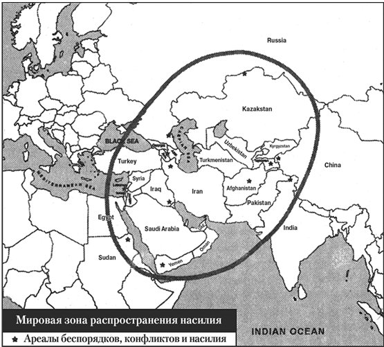 Этот огромный регион, раздираемый ненавистью, которую легко разжечь, и окруженный конкурирующими между собой могущественными соседями, вероятно, является и огромным полем битвы, на котором происходят войны между национальными государствами, и зоной (это скорее всего), где царит затянувшееся этническое и религиозное насилие. Будет ли Индия выступать в качестве сдерживающего фактора или же воспользуется некоторыми возможностями, чтобы навязывать свою волю Пакистану, в большой степени скажется на региональных рамках возможных конфликтов. Внутренняя напряженность в Турции и Иране, вероятно, не только усилится, но значительно снизит стабилизирующую роль, которую эти государства могут играть во взрывоопасном регионе. Такие события, в свою очередь, возможно, затруднят процесс ассимиляции международным сообществом новых государств Центральной Азии, а также отрицательно повлияют на безопасность в Персидском заливе, в обеспечении которой доминирующую роль играет Америка. В любом случае и Америка, и международное сообщество могут столкнуться здесь с проблемой, по сравнению с которой недавний кризис в бывшей Югославии покажется незначительным (см. карту Х).