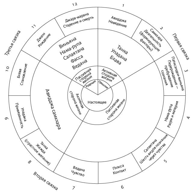 В рамках концепции «взаимозависимого возникновения» описывается 12 звеньев причинно-следственного цикла. Все, что происходит, зависит от какого-либо действия, его породившего: «Когда есть это, есть то. Когда нет этого, то нет и того». Эта идея привлекла мое внимание, поскольку имела сходство с описанным спустя 2500 лет оперантным обусловливанием, или обучением на основе вознаграждения. Вот как это происходит. Когда мы испытываем какие-либо ощущения, мозг интерпретирует их в соответствии с нашим прошлым опытом (что в классических текстах называется «неведением»). Такая интерпретация автоматически определяет «характер ощущения» – приятный или неприятный, который, в свою очередь, порождает определенное желание или стремление: если ощущение приятное, его хочется продлить, если неприятное – прекратить. Руководствуясь этой мотивацией, мы действуем под влиянием своих побуждений, и в результате формируется то, что в буддийской философии называется я-идентичностью. Интересно, что термин, которым обозначается эта влияющая причина (упадана), переводится на английский язык как attachment – «привязанность»: именно на этом часто сосредоточена западная культура. Исход действия откладывается в памяти, что в дальнейшем обусловливает очередной «цикл перерождения», называемый также «сансара», или «бесконечное блуждание».