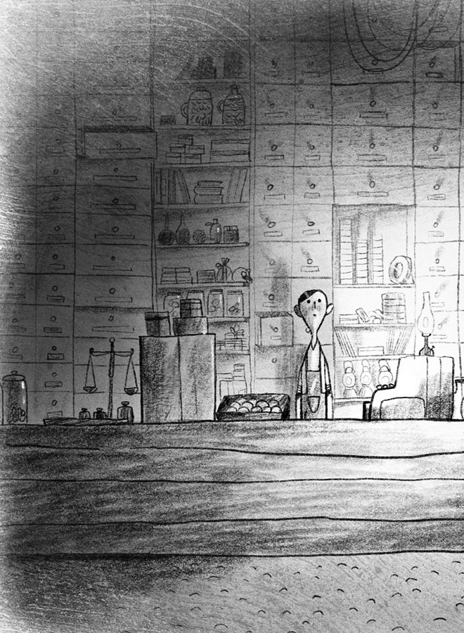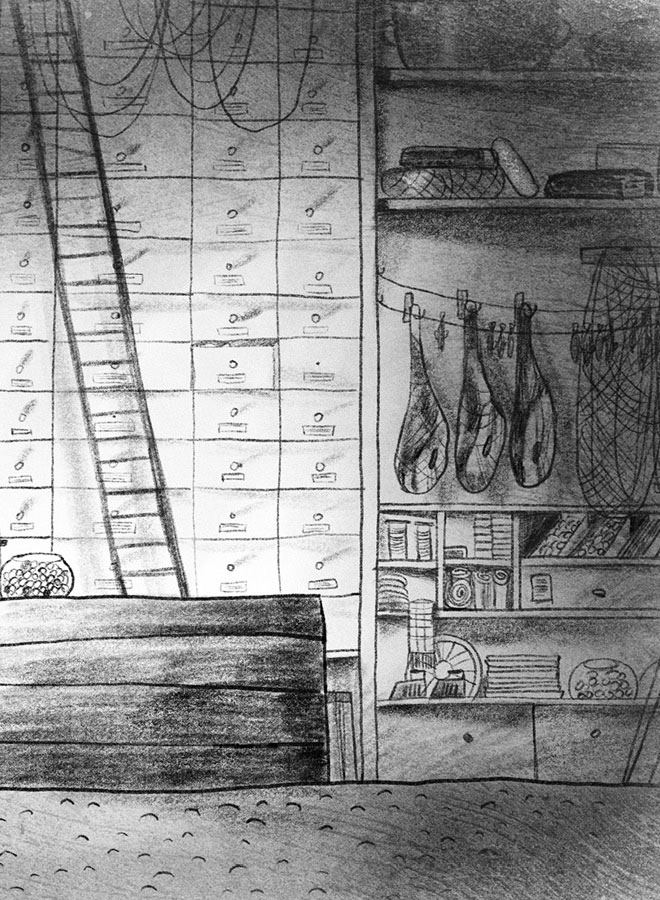Я уже собиралась вернуться к Лине, когда увидела эту улочку, которая не ведет никуда – теряется в полях. «Ладно, пройду ее до конца и поверну обратно…» Дошла до последнего дома. Прочла вывеску: БАКАЛЕЯ – большими синими буквами. Дверь была открыта. Я тихонько вошла. Ты сидел за прилавком в своем сером фартуке бакалейщика, глубоко задумавшись – господи, до чего же глубоко! Мне показалось, что ты где-то далеко-далеко… Ну и надо было мне что-нибудь сказать. Ты меня не замечал, а это не очень-то вежливо – подсматривать за кем-то, кто тебя не видит. И тогда я сказала вот что: