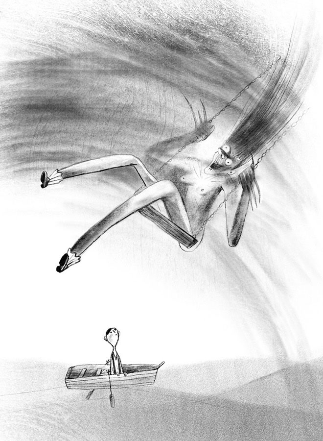 Гигантские качели с чудовищно скрипучими железными крючьями висели на радуге. В плотном тумане слышался только этот ритмичный скрип. Жизнь остановилась. Томек засомневался, бьется ли еще его сердце. Он дрожал от сырости. Он попробовал грести, чтобы немного согреться, но баркас не продвинулся ни на миллиметр. И тут он увидел тварь, сидящую на качелях. Он не представлял, что может существовать создание столь отвратительное. Это была женщина. Она выглядела лет на сто пятьдесят: тощая, на костях висели дряблые лохмотья бледной кожи.