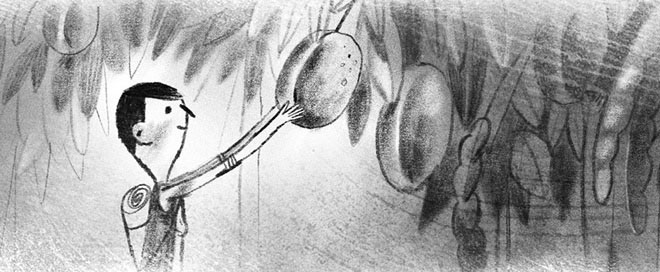 Скалы заканчивались полосой светло-желтого песка. От песка до самого горизонта тянулся лес – огромные зеленые деревья. Несмотря на дрожь в ногах, Томек быстро сбежал вниз. Он обнаружил, что на деревьях полно незнакомых фруктов. Он сорвал какой-то плод, похожий на абрикос, только размером с дыню. Разломив его надвое, Томек увидел внутри сок, похожий на молоко. Сначала он пил осторожно, потом уже не мог оторваться. По вкусу сок напоминал оршад. Потом он выковырял сочную мякоть. Она оказалась отменной. Потом попробовал фасоль со вкусом лакрицы, странные мягкие кексы, вкусные, как сахарные булочки. Но самым главным открытием стали черные круглые плоды с твердой кожурой, наполненные теплым маслянистым пюре со вкусом вареной картошки. Томек, сидя на камне, наелся ими до отвала, запивая соком гигантского абрикоса.