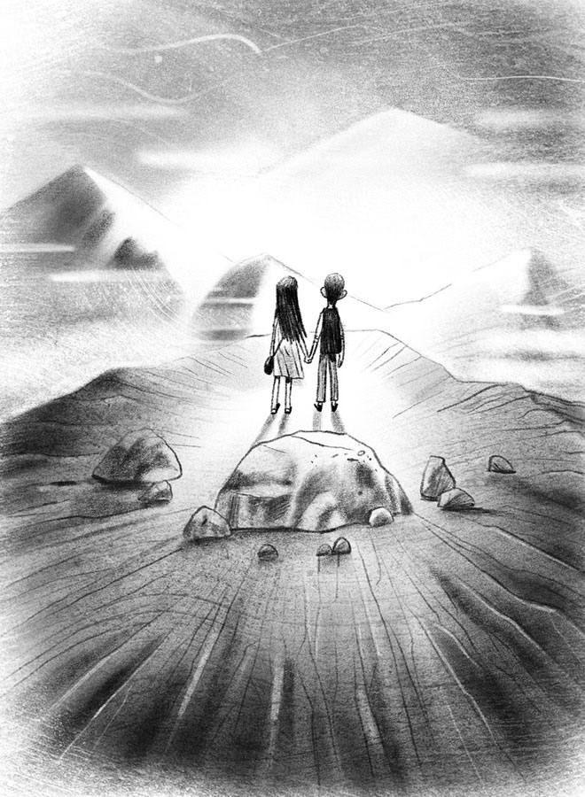 Приставала немного сник. Пешие прогулки не были его любимым занятием. Троица шла вдоль берега, пока не выбилась из сил. Склон становился все круче. Перед тем как стемнело, они разбили лагерь на большой скале. У Ханны были с собой кремень и огниво, и они развели костер. Они съели припасенные Томеком орехи и легли, прижавшись друг к другу. Засыпая, Томек вспомнил слова старика Ишама: «Никто оттуда не возвращался… это так же невозможно, как вырастить рожь на ладони…» Он посмотрел на Священную гору, возвышавшуюся перед ним темной опасной громадой, и задрожал. Теперь он был не один, и, как ни странно, это не внушало ему спокойствия. Напротив. «Я старший, я должен их защищать…» Он завернулся в одеяло и прижался к теплому боку Приставалы.