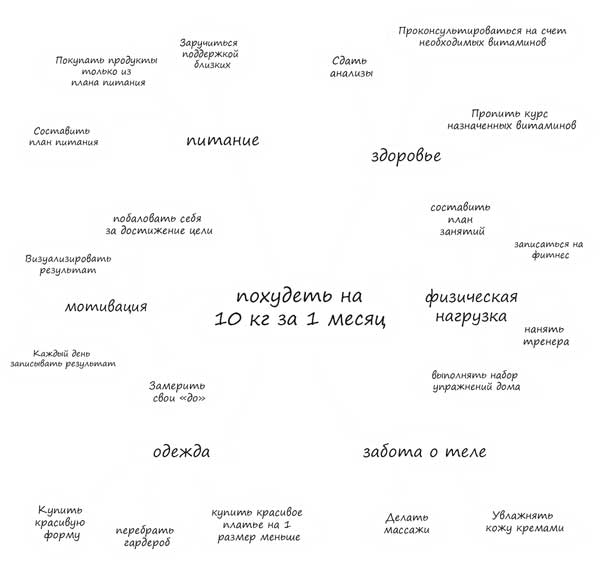 Вы рисуете кружочек с вашей целью и от него – стрелочки. На что я могу повлиять, чтобы похудеть? Первое – питание. Это кружочек номер один. Дальше пошла стрелочка: на что я могу повлиять, чтобы похудеть на 10 кг за один месяц? Это физическая нагрузка, какой-то спорт. Дальше. На что я могу ещё повлиять? Это забота о теле: кремы, процедуры и прочее. Это продукты в моём холодильнике. Купить себе красивую одежду на размер меньше, чтобы она меня мотивировала её поскорей надеть – и это всё отдельными кружочками. То есть вы описываете всё-всё, хорошенько думая и размышляя над этим. А мотивация? Как я могу повлиять на неё? Вот я похудею – что я получу? Какая плюшечка меня там ожидает? Это тоже нужно описать. Потом уже лучики третьего уровня. Что такое правильное питание? Осознать, что у меня есть сейчас и что ещё необходимо. Например, прописать диету, сдать анализы, понять, на какие витамины нужно обратить внимание, проконсультироваться с нутрициологом. Так мы получаем схему задач. Блок питания, в котором их условно 10 штук. У каждой задачи ещё может быть подзадача, но я не буду так сильно углубляться.