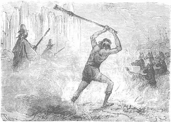Талькав уже начал подавать этому пример, и, когда какой-нибудь волк слишком приближался к пылавшему костру, патагонец просовывал сквозь пламя длинную руку, вооруженную ножом, и каждый раз он обагрялся кровью волка.