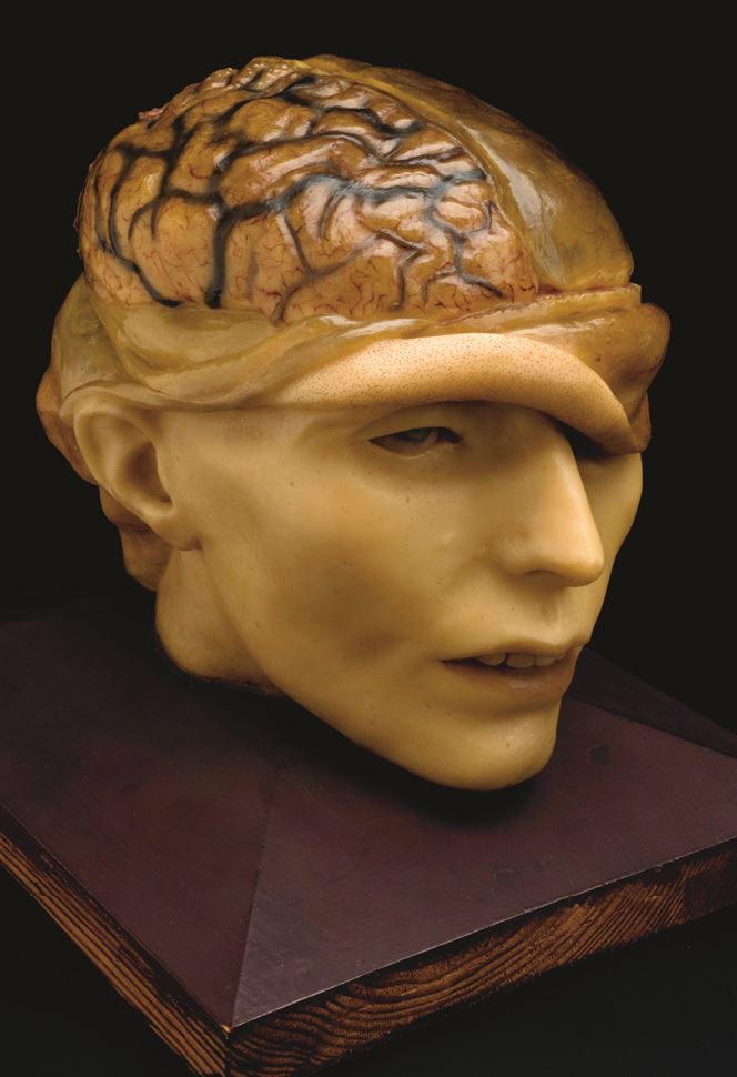 3. Эта анатомическая восковая модель (дата создания неизвестна) предлагает нам изображение черепной аутопсии, демонстрируя мозг, видимый после рассечения по кругу костей и мягких тканей черепа; данную модель могли использовать в педагогических целях или выставлять на обзор широкой публики