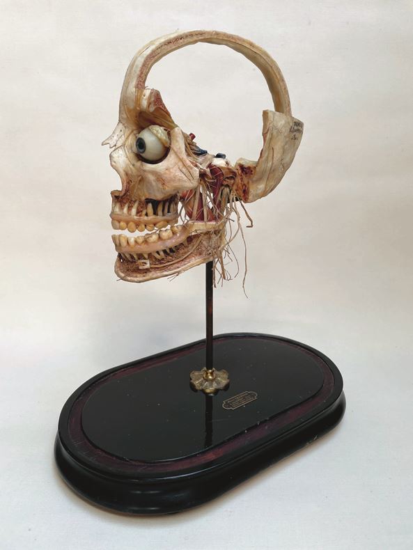 6. Анатомическая модель левой половины человеческого черепа с глазным протезом и восковым муляжом нервной системы нижней части лица, экспонировавшаяся под колпаком. Выполнена домом Руппер-Трамон в начале XX в.