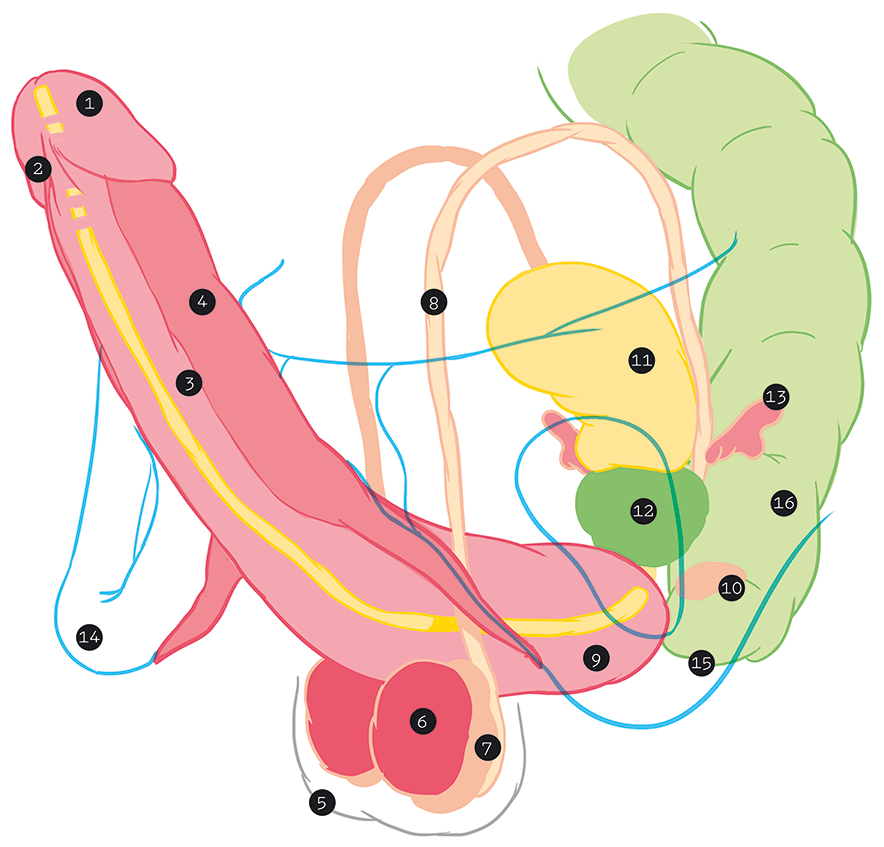 Оно расположено под пещеристым телом и прячет в себе уретру. Губчатое тело обладает двумя «выпуклостями» на обоих концах: головка впереди и луковица мочеиспускательного канала сзади