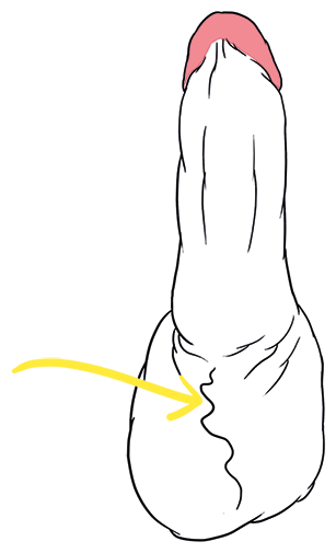 Дорожка на поверхности мошонки называется швом. Это остаток того, что могло бы развиться в большие половые губы, если бы ты родился с вульвой. Можешь себе представить, а?
