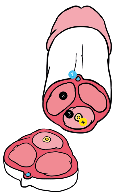 Они находятся в верхней части пениса, с его внешней стороны, почти внутри ствола. Как и клитор, они разделены между собой и формируют ножки пениса, прикрепляющиеся к тазовому дну.