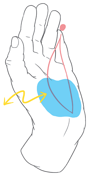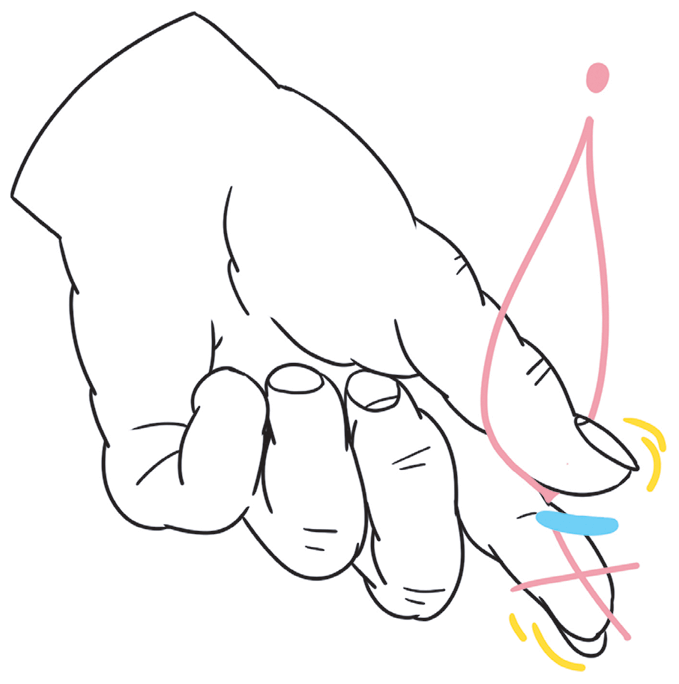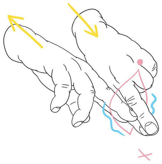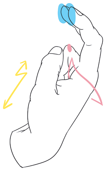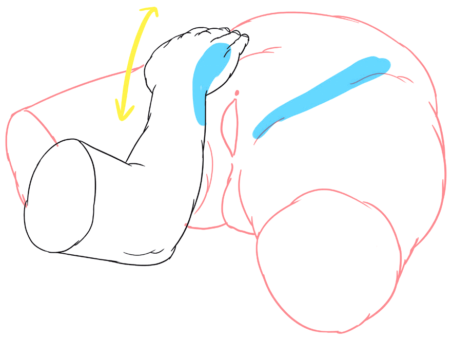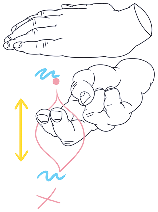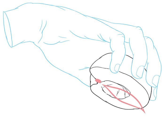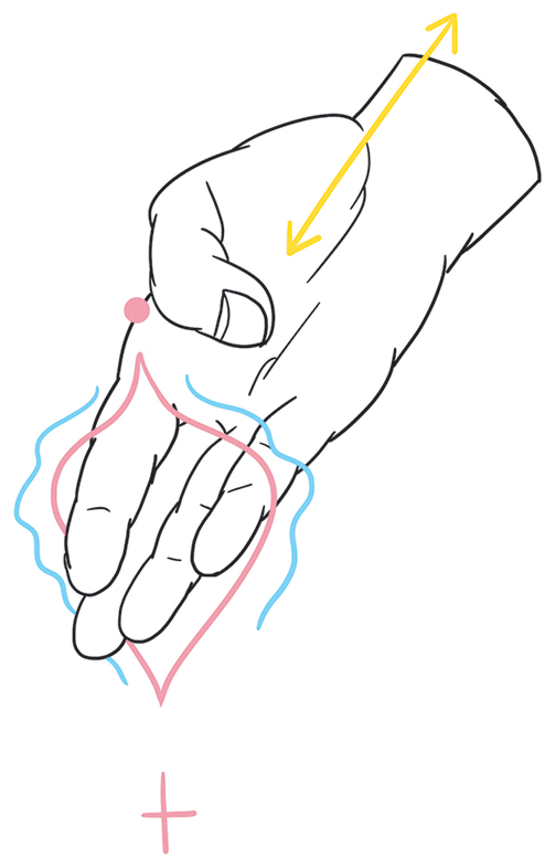 Начни с того, чтобы сложить щепотью указательный и средний пальцы. Пальцы и запястье сохраняют свое положение, а вертикально направленное движение создается за счет движения предплечья. Пальцы ритмично нажимают на низ живота сзади, чуть выше лобка, куда ты надавливаешь второй рукой. Ритм должен быть равномерным, я надеюсь, что у тебя достаточно сильные руки.