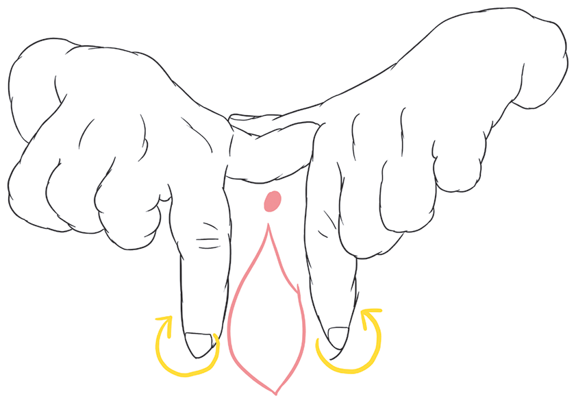 Поставь пальцы на большие губы и легонько раздвинь их, чтобы разделить и малые и открыть преддверие влагалища. А теперь помассируй его мелкими круговыми движениями. Это невероятный кайф.