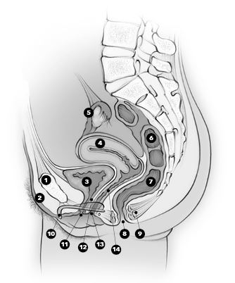 Влагалище: мышечно-эластичное трубчатое образование, расположенное между отверстием уретры и промежностью. Функция влагалища заключается в половом акте и родах. Во время полового акта влагалище действует как резервуар для спермы, которая проходит через шейку матки в поисках яйцеклетки для оплодотворения. По влагалищу из организма выводится и менструальная кровь.