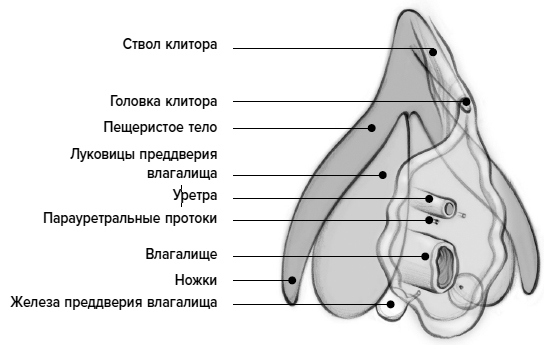 Часто сравниваемый с айсбергом, клитор почти целиком спрятан под поверхностью тела в обширном подземном королевстве. За видимым нами выступом с капюшоном тело, ножки и луковицы клитора образуют полную нервов и кровеносных сосудов перевернутую букву Y, которые с двух сторон охватывают влагалище, с дополнительными ответвлениями, уходящими в недра таза на глубину до девяти сантиметров. Все части под поверхностью состоят из эректильной ткани, что означает, что при возбуждении они набухают, еще больше увеличиваясь в объеме. Эта скрытая масса, полностью вовлеченная в процесс, наливается кровью и искрит от активной работы нервных окончаний.