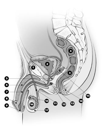Уретра: проток, по которому моча из мочевого пузыря выводится из организма. Мужская уретра является также частью половой системы и выводит сперму из яичек.