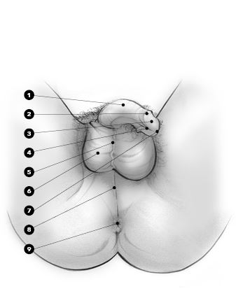 Уздечка: очень эрогенная полоска ткани на нижней поверхности головки, которая соединяет крайнюю плоть с половым членом. В пенисах с удаленной крайней плотью, чувствительность уздечки сохраняется.